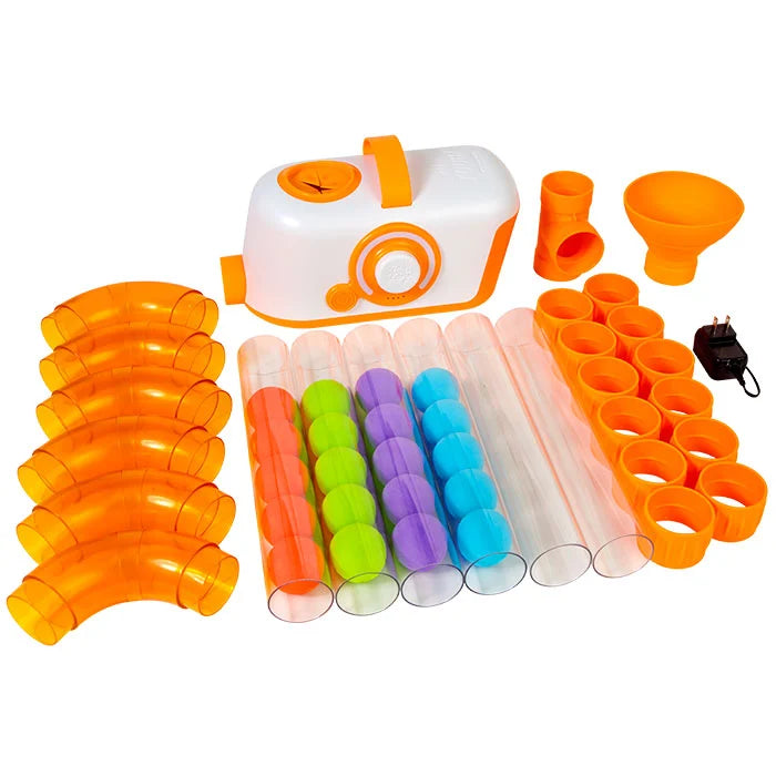 - Includes 20 colorful EVA foam balls, 6 transparent 12-inch tubes, 6 transparent orange corner tubes, 1 T-tube, 1 silicone funnel, 12 easy-fit connectors, 1 fan unit, charging cable