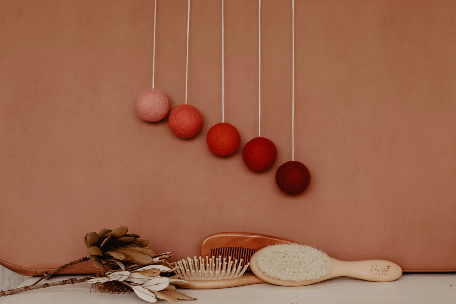 Our gorgeous three piece Hair Brush & Comb Set is super soft. Perfect for your baby's delicate crown. Both the brush and comb have curved, wooden handles for easy and comfortable grip.