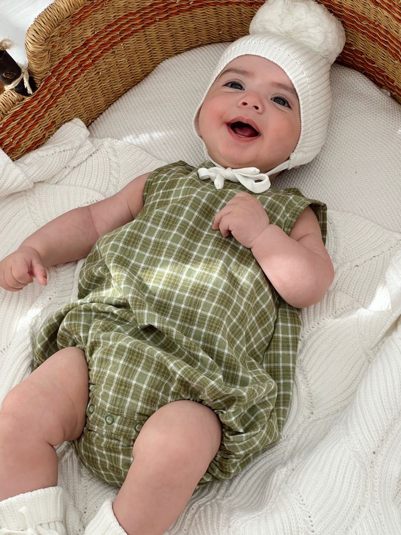 Cotton bubble romper in our Thyme fabric. Functional snap buttons at back of neck and crotch for easy on/off and nappy changes. Mix and match with items from our Christmas Collection.
