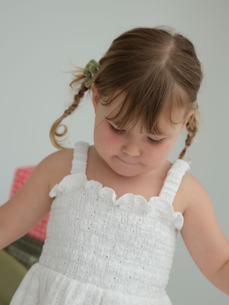 Cotton dress in our Laurel broderie anglaise fabric. Shirred bodice with adjustable button hole straps. Mix and match with items from our Christmas Collection.