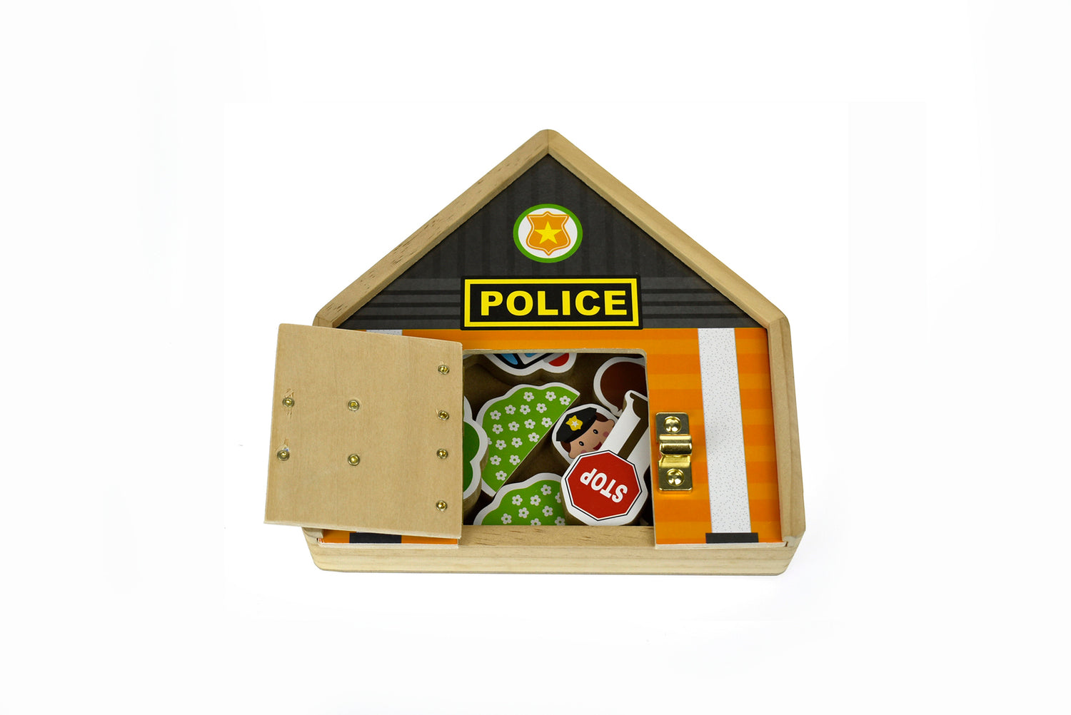This Metal Latch Police Station from Kaper Kidz has everything you need for some great law and order pretend play. Undo the latch on the Police station and pull out the wooden figurines and fire truck and you're ready for action. This set comes with 9 wooden objects and figurines and one police car with movable, rolling wheels.