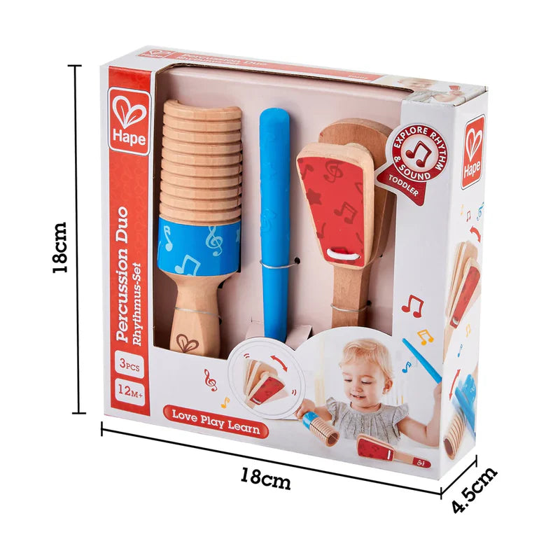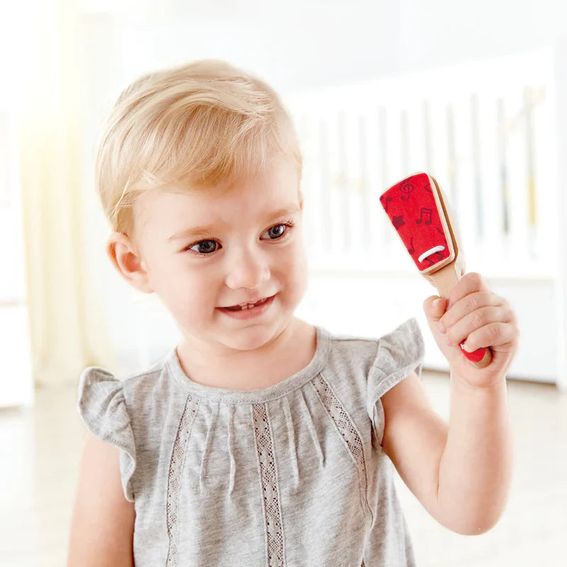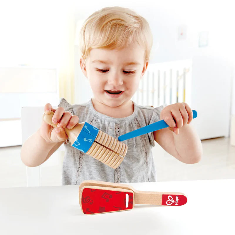 Hape's Percussion Clapper and Guiro with Stick set creates a steady beat and rhythm. The musical instruments will keep your budding musician playing for hours on end.