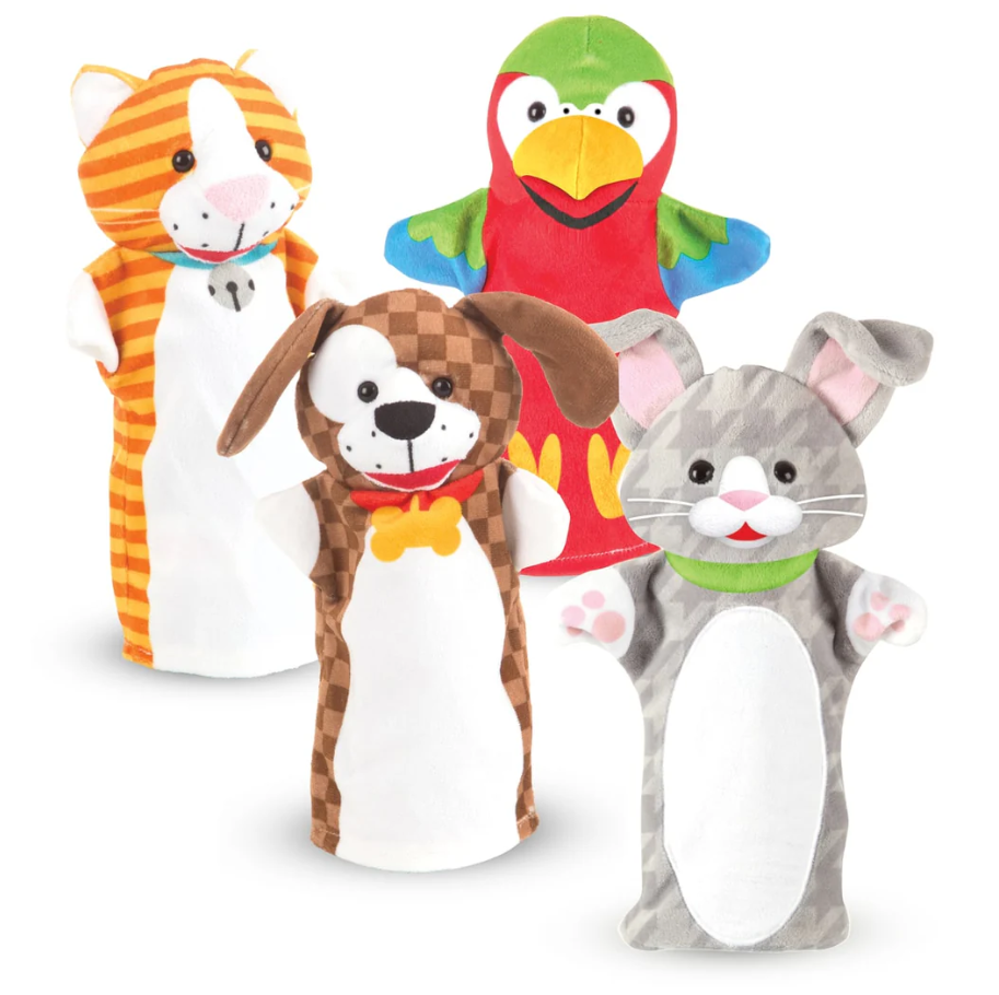 - Four soft friendly animal hand-puppets in a playful pets theme