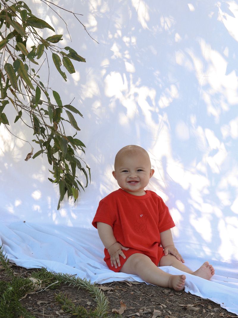 Terry towelling playsuit featuring our Shawn the Prawn design on the front. Functional press snaps at crotch for easy nappy changes and press snaps at shoulders for easy on/off.