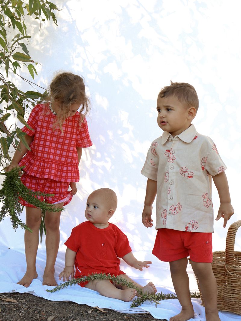 Linen blend shirt featuring our Shawn the Prawn design. Functional buttons down the front. Matching shirt also available in mens.