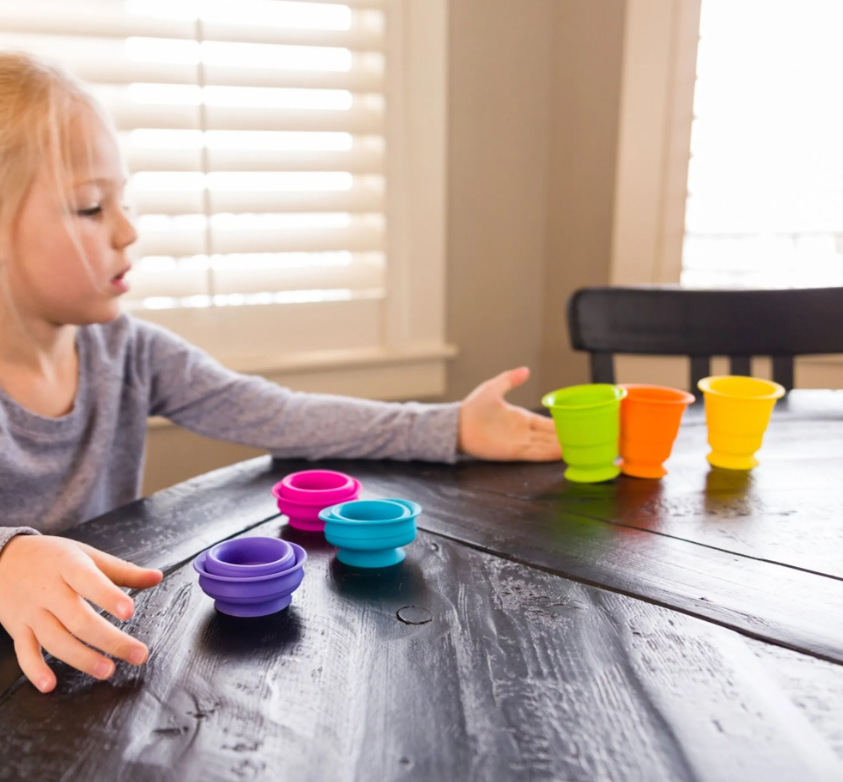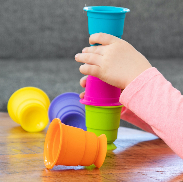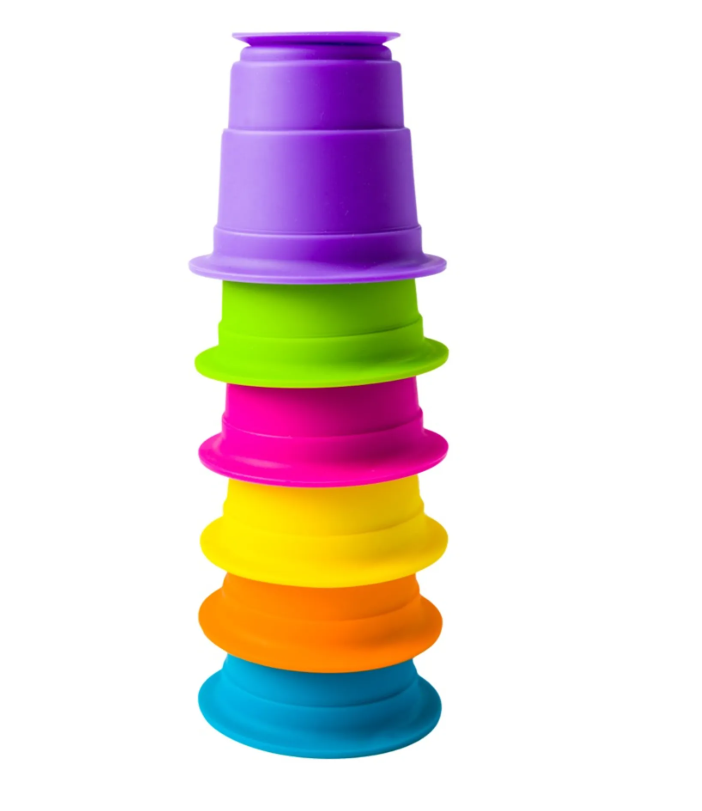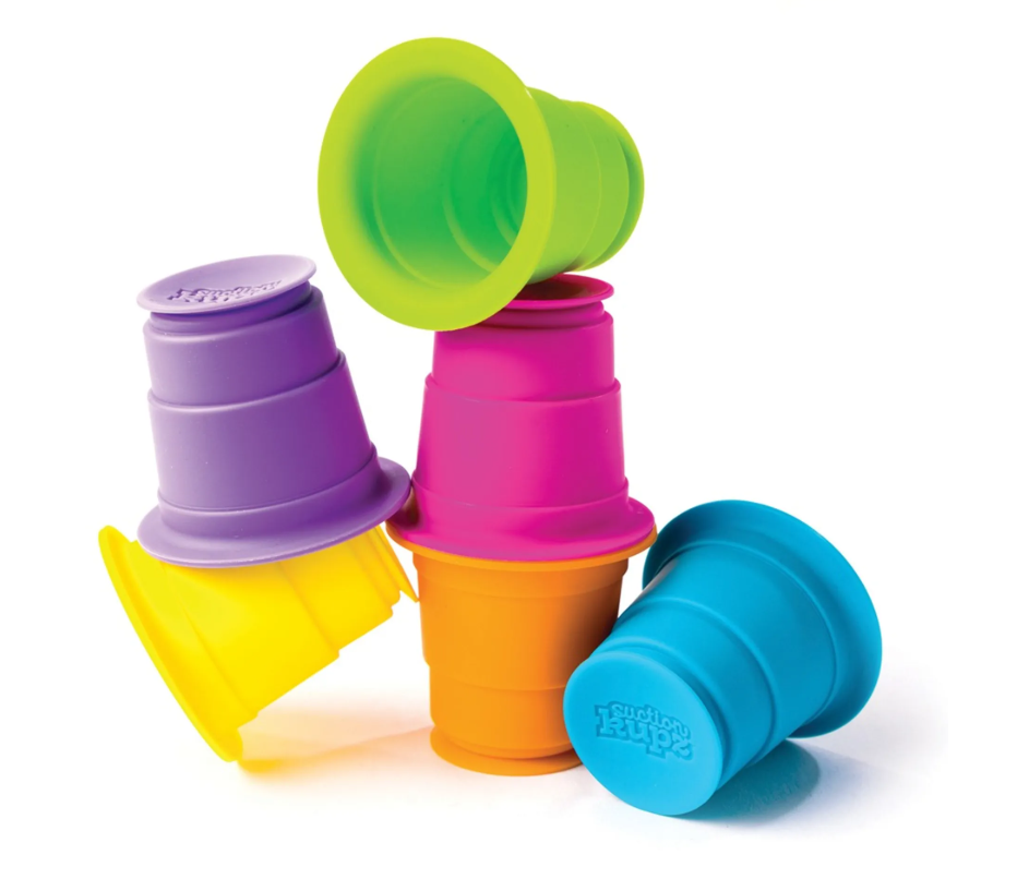 Stack, roll, stick, and sip! Each of these six colorful, squishy cups features a suction cup on the bottom, a suctioning brim at the top, plus endless creative-play possibilities all around. Bring them in the tub for scooping, pouring, and floating.