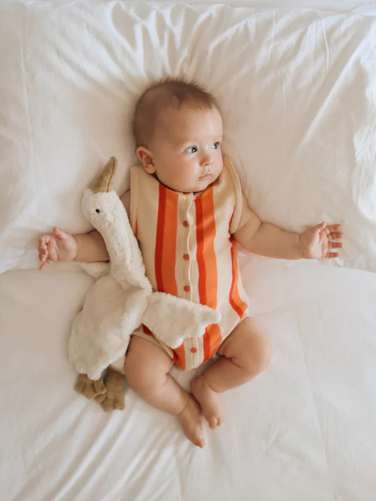 Knitted Fiesta bubble romper featuring Flame + Salsa coloured stripes. Functional snap buttons down the front and on the crotch for easy on/off and nappy changes.