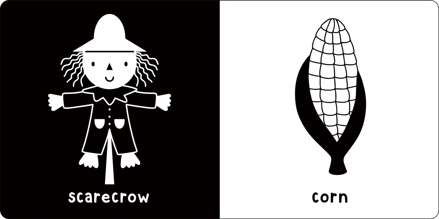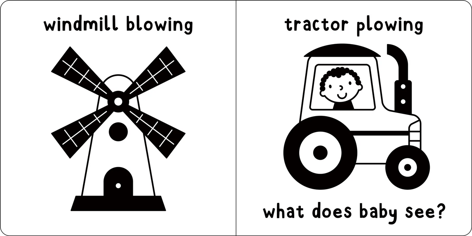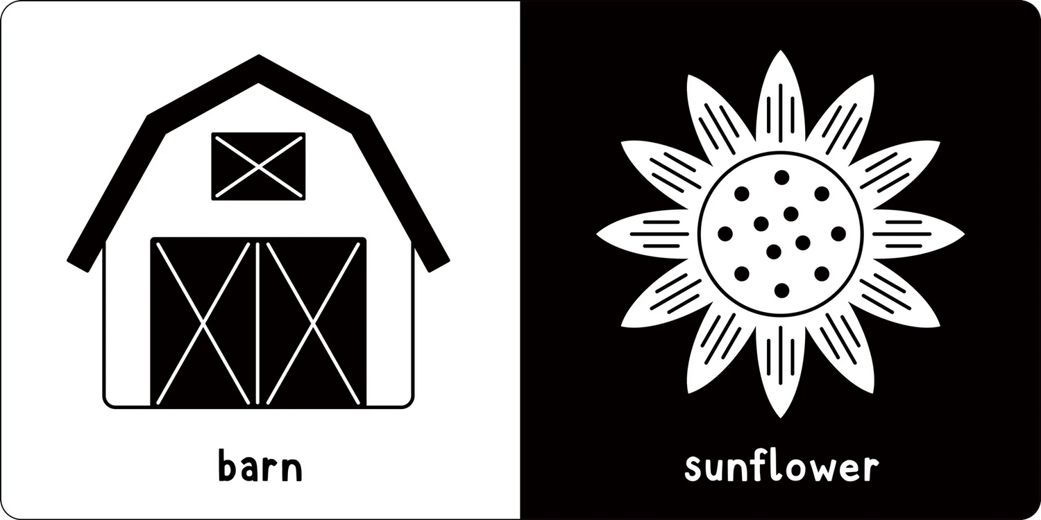 - On the Farm: A First High-Contrast Book, with bold, black-and-white images, will introduce your baby or toddler to important first concepts for every growing child!